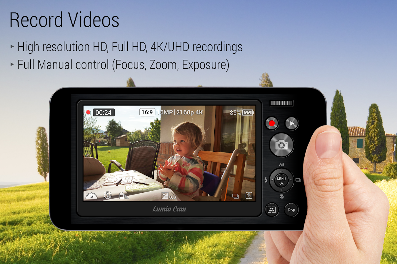 Lumio Cam ağıllı telefonların son texnologiyası ilə görünüş və professional DSLR kameraların funksiyalarını birləşdirərək gerçək fotoşəkil kameralarından ilhamlanıb hazırlanan kamera proqramıdır. Professional fotoqraflıq yolunda yeni başlayanlar üçün asan və professional bir tətbiqdir. Instagram, Facebook, Youtube, Vimeo və digər sosial şəbəkələrə fotoşəkil və video çəkmək üçün ideal bir vasitədir. Bütün böyük markalardan tutmuş kiçik markalara (Samsung, LG, Sony, Huawei, Motorola, HTC, Asus, One Plus, Nexus və s.) bütün modellərə uyğundur. Bu tətbiq ilə professional kameranın bütün xüsusiyyətlərini öyrənə bilərsiniz.